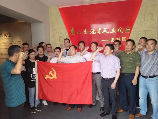 在紀(jì)念館史料展廳背景前,面對鮮紅的中國共產(chǎn)黨黨旗,全體黨員莊嚴(yán)地舉起右手,握緊拳頭,集體宣讀入黨誓詞,重溫入黨時(shí)的莊嚴(yán)承諾和堅(jiān)定決心。