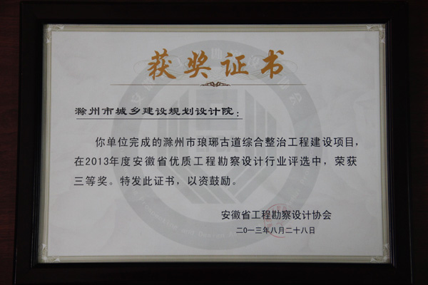 安徽省工程勘察設(shè)計(jì)協(xié)會(huì)于2013年8月3日組織專家召開(kāi)安徽省優(yōu)秀工程勘察設(shè)計(jì)行業(yè)獎(jiǎng)評(píng)審會(huì),對(duì)全省共62家單位上報(bào)的320個(gè)項(xiàng)目進(jìn)行了為期兩天的評(píng)選。由我院市完成的滁州市瑯琊古道綜合整治工程建設(shè)項(xiàng)目在2013年度安徽省優(yōu)秀勘察設(shè)計(jì)行業(yè)評(píng)選中,榮獲三等獎(jiǎng)。