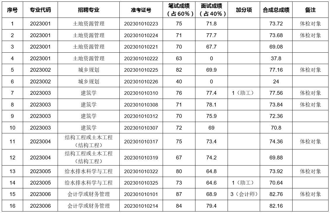 根據(jù)《2023年度滁州市城鄉(xiāng)建設規(guī)劃設計院有限公司公開招聘技術人員公告》規(guī)定,現(xiàn)將2023年度滁州市城鄉(xiāng)建設規(guī)劃設計院有限公司公開招聘技術人員筆試、面試、加分合成總成績和體檢對象公布如下: