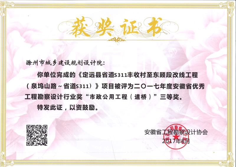 定遠(yuǎn)縣省道S311豐收村至東顧段改線工程獲獎證書